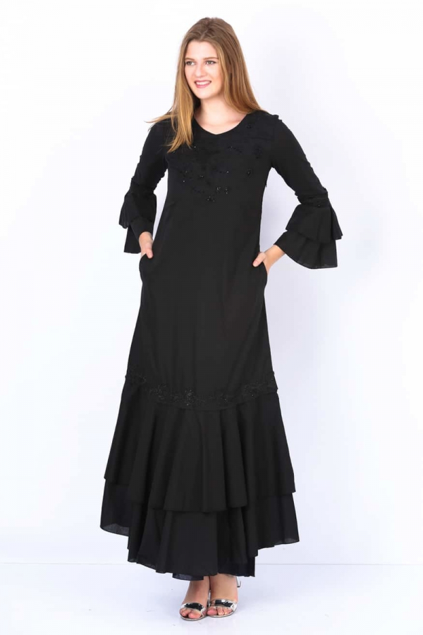 Siyah Renktedir. Astarsızdır. Dokuma Kumaştan üretilmiştir. V Yakalıdır. Volan Kolludur. Taş Işlemesi Vardır. Etek Ucu Fırfırlıdır. Yazlık Bir ürün Olup Rahat Kullanıma Sahiptir. Ürünlerimiz Birinci Sınıf Kumaş Ve Işçilikle üretilmiştir.